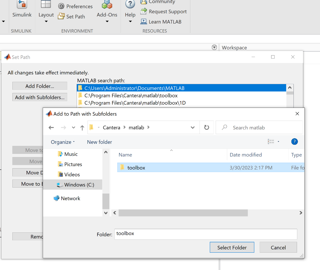 Matlabis endas - Menüüst Environment valida Set Path - Add with Subfolders - C:\Program Files\Cantera\matlab\toolbox - select folder – Save