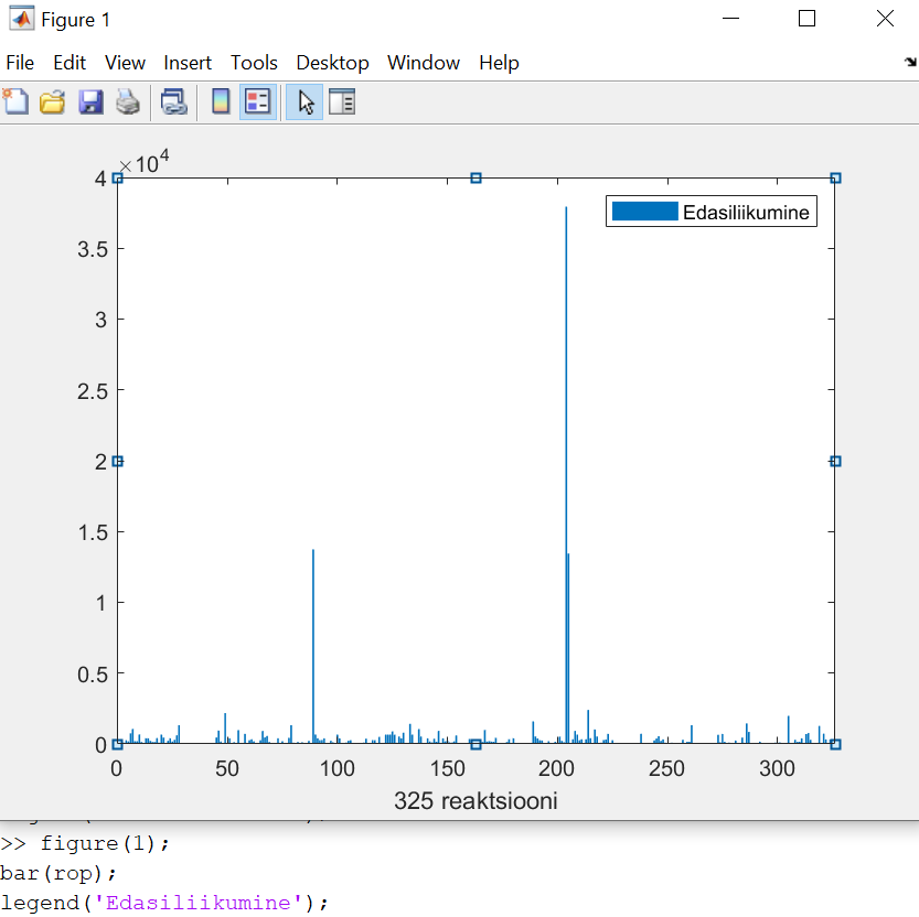 Loodud graafik, reaktsioonide edenemise kiirus. Enamikul reaktsioonidel on tulp null. See on normaalne, sest GRI30 mehhanismis on 325 reaktsiooni, kuid näites kasutatud segus on: