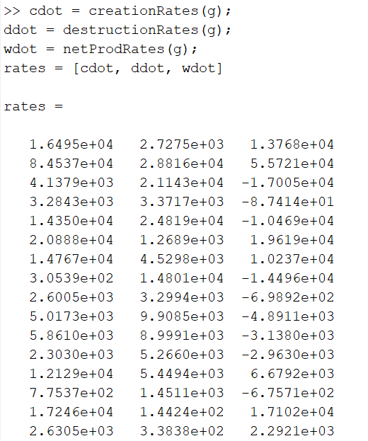 Eeltoodud tulemused on jaotunud veergudeks, kus esimene veerg on liik (mis liiki reaktsiooniga on tegemist, cantera sisene) ja teine veerg on reagendi koefitsient: Järgnev näide on Cantera tulemuste näide.