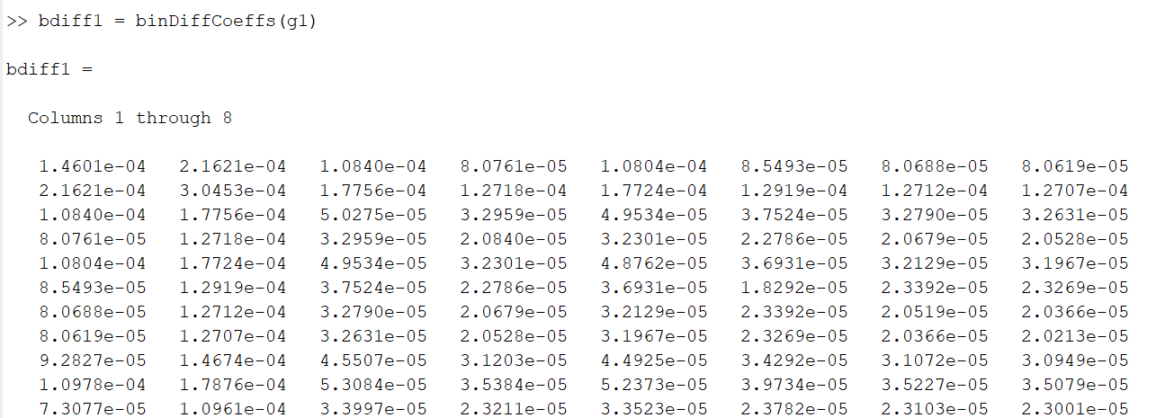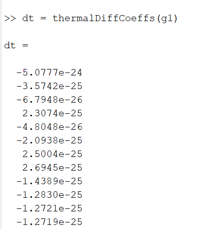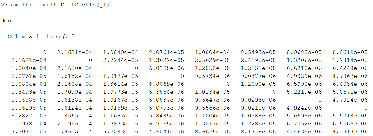 Käsk multiDiffCoeffs(g1) tagastab mitmekomponendilise difusioonikoefitsientide maatriksi, mille iga element Dij, kirjeldab liigi i difusioonivoolu tundlikkust liigi j kontsentratsioonigradientide suhtes. Maatriks on suurusega liikide arv × liikide arv (nt 53×53 GRI30 korral) ja annab täieliku Maxwell–Stefani mudeli koefitsiendid. Seega tabel ei näita üksikuid difusioonikoefitsiente, vaid kõigi liikide omavahelisi difusioonisuhteid.