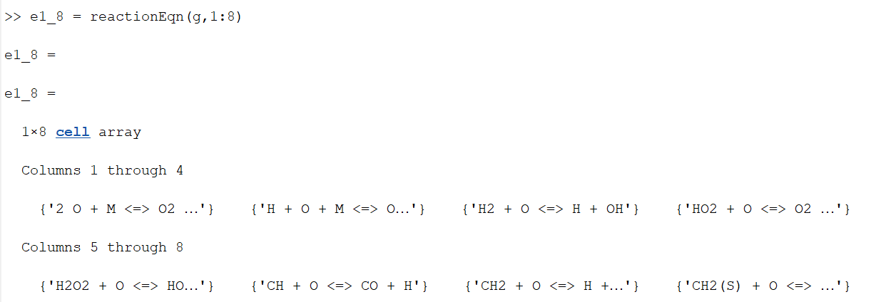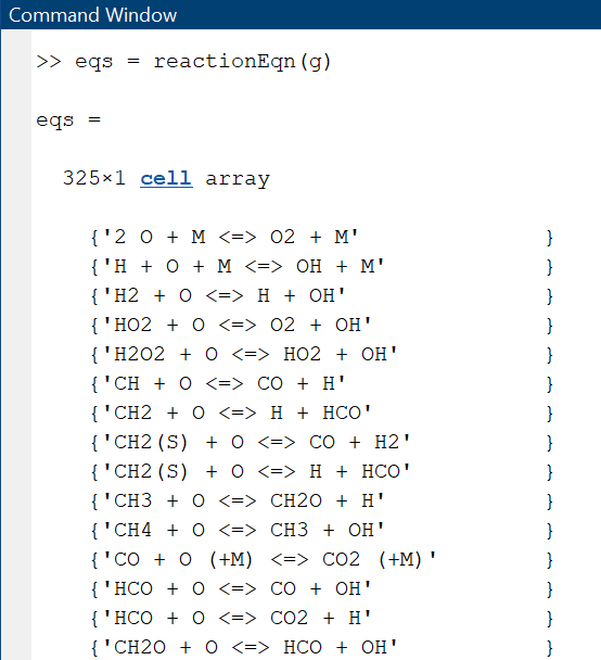 Erinevad võimalused, kuidas näha mingi kindla ainete kogumiku reaktsioone. Näidiseks on valitud g = GRI 30 (53 liikide kogumik). Selleks, et näha konkreetselt viiendat reaktsiooni tuleb sisestada käsk: