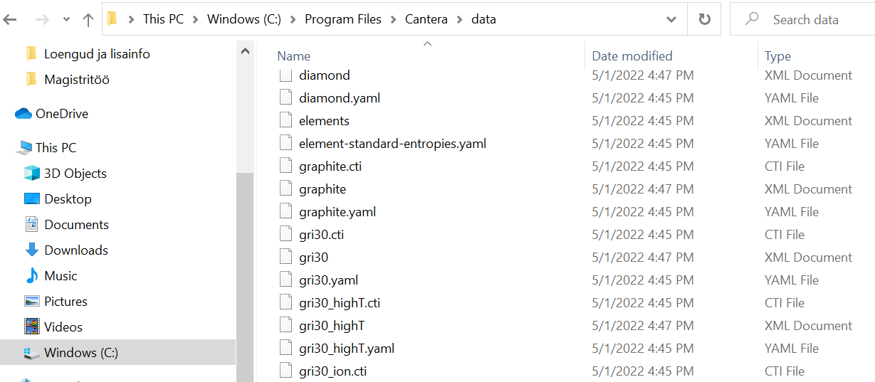 Antud näidis oli loodud kasutades gri30.yaml sisendfaili. Cantera andmete hoidlas on olemas veel palju selliseid faile, kus on kirjeldatud erinevate ainete omadused, vaata joonist.