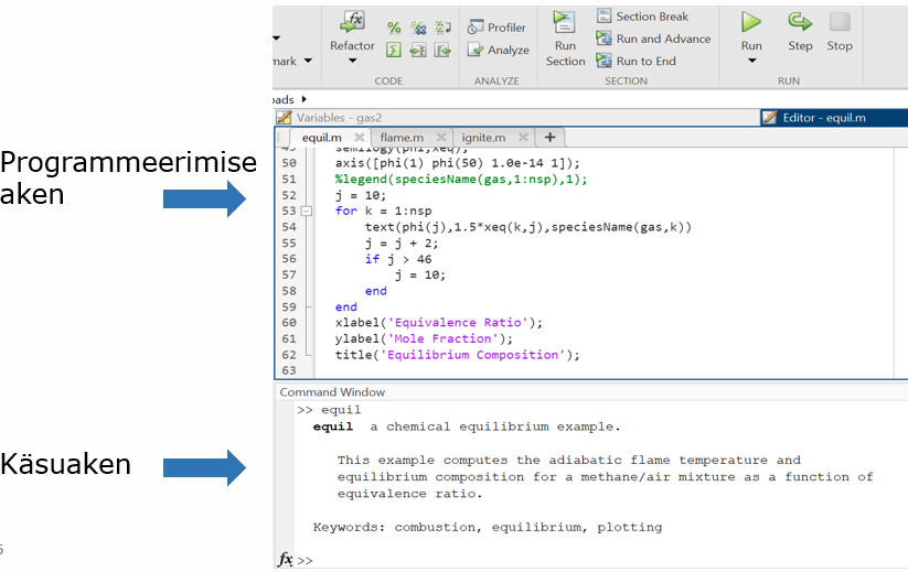 MatLabis kasutatakse koodi kirjutamisel kahte akent, programmeerimise aken ning käsuaken. Kui Command Windows (käsuaken) näha ei ole, siis saate selle lisada Layout nupu alt, Show >> Command History. Vahe seisneb selles, et programmeerimise aknas võib kirjutada mitu koodirida järjest ning lisada kommentaare. Tulemuste väljastamiseks vajutatakse rohelist nuppu RUN. Käsuaknasse kirjutatakse ühe koodirea kaupa ning tulemuste väljastamiseks tuleb vajutada ENTER. Töötamisel pole oluline, kuidas aknad paigutuvad. Paigutage need nii, nagu on mugav töötada. Näited mõlemast aknast on toodud järgnevalt: