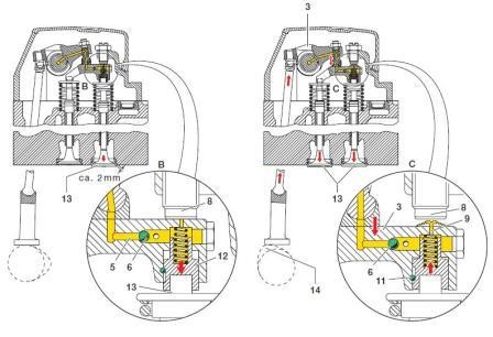 Vasakpoolsel selel on kujutatud EVB tööpõhimõtet. Klapivedrud suruvad nookuri (3) vastu tuge (8) ja õlikanal (9) on suletud. Õli rõhu mõjul liigub kolb (12) käigu piiraja poolt lubatava pikkuse võrra (ca 2 mm) allapoole ja avab samavõrra väljalaskeklappi. Sel viisil luuakse gaaside liikumisele lisatakistus. Parempoolsel selel avanevad väljalaskeklapid tavalisel viisil.